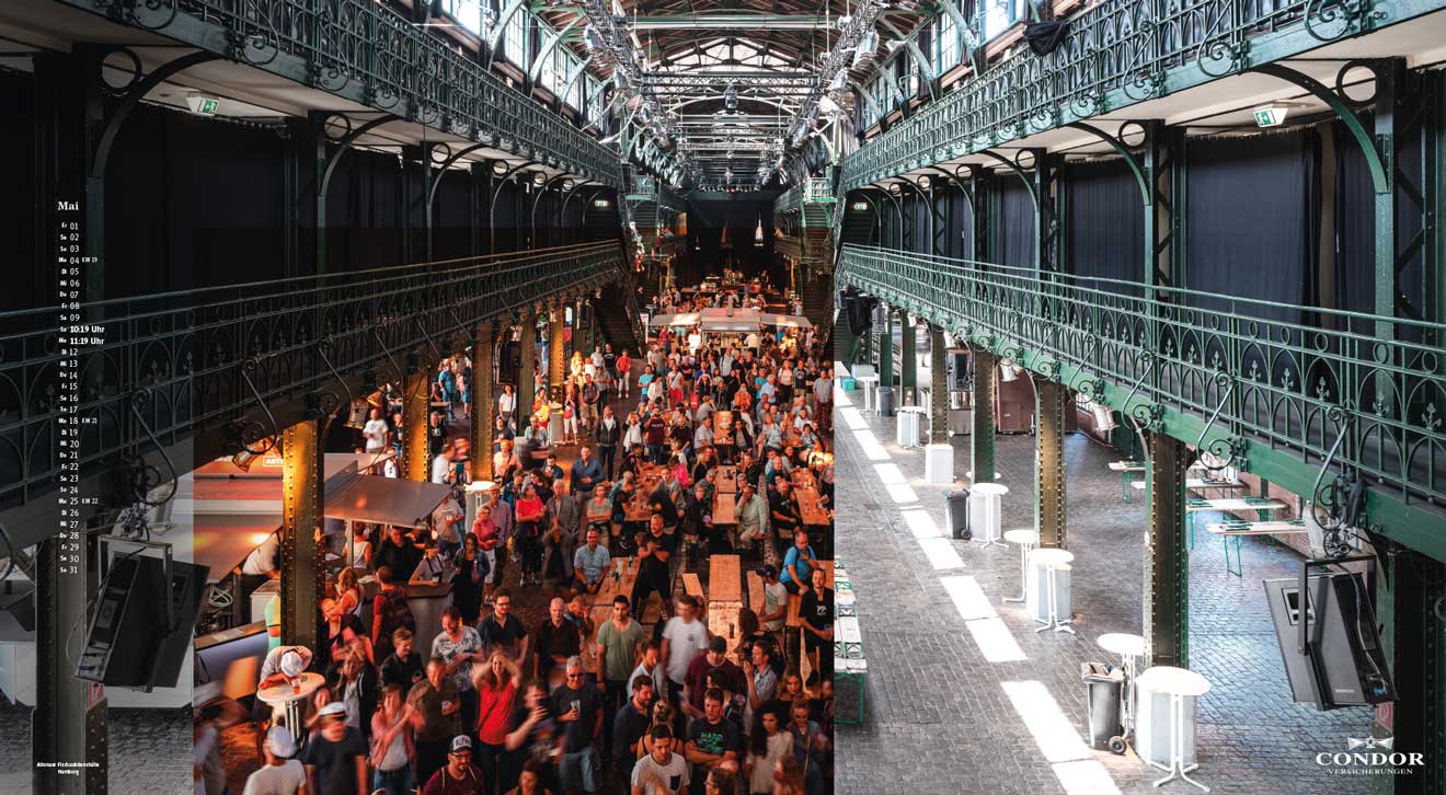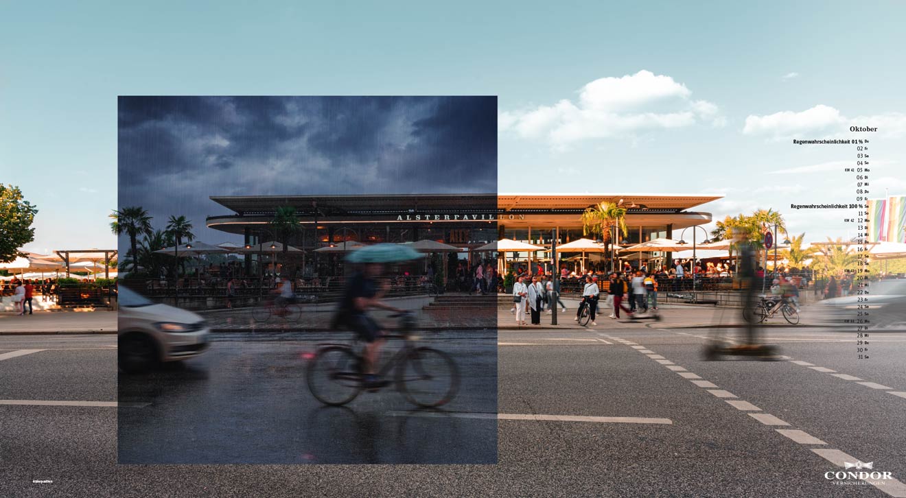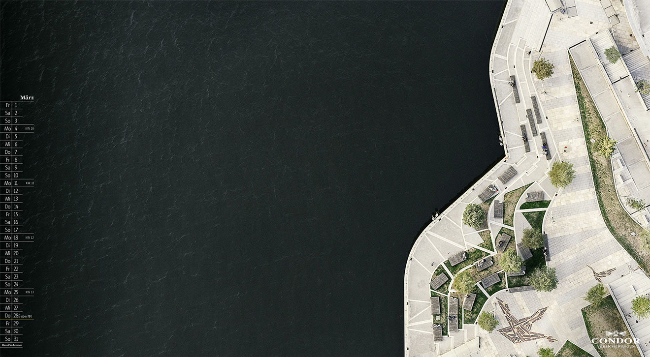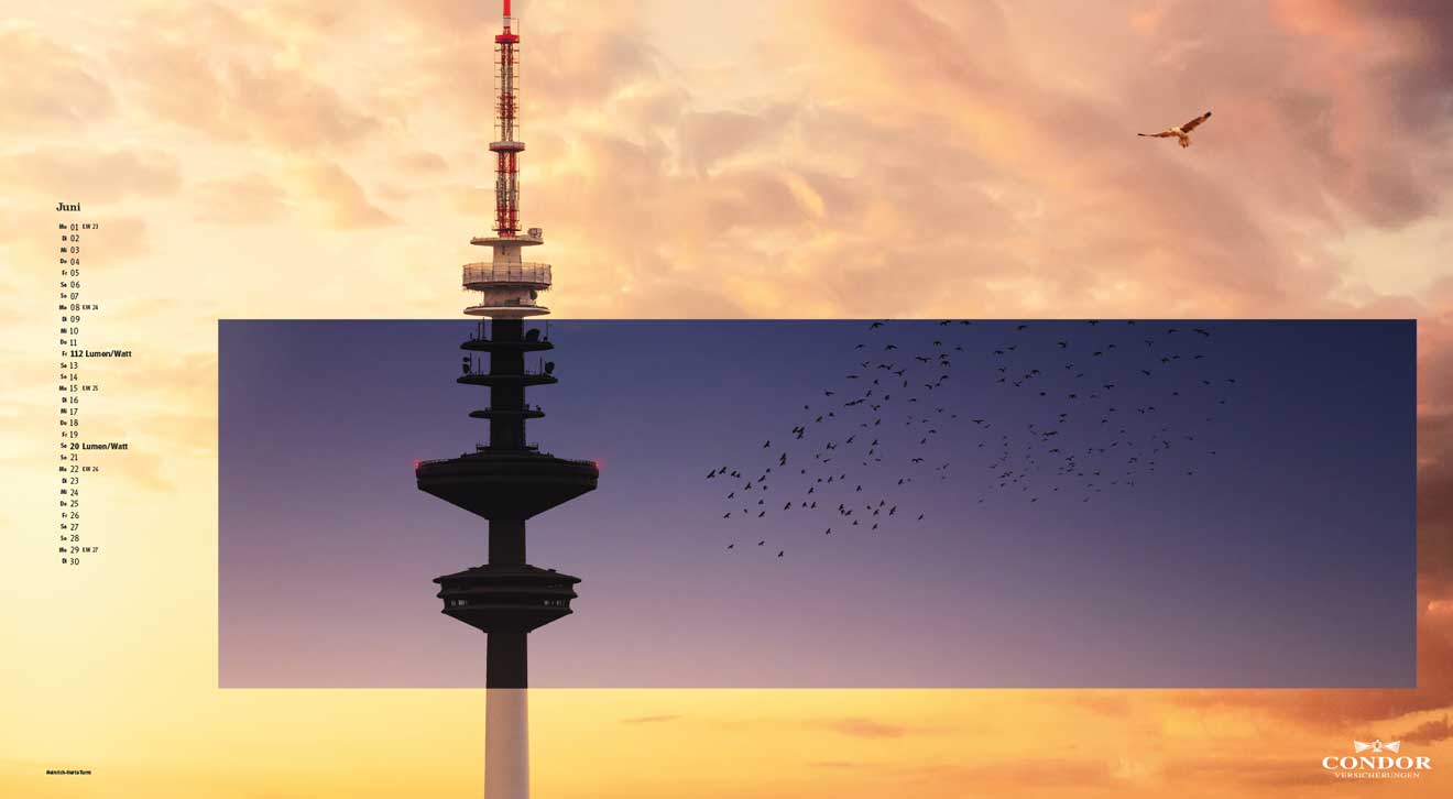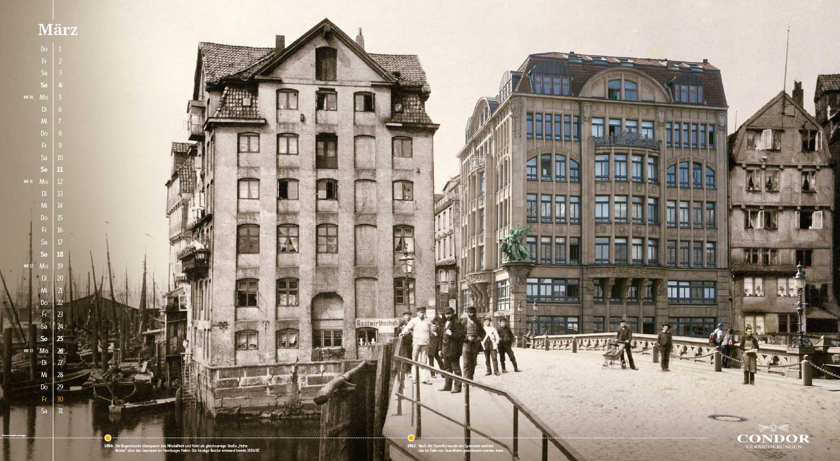 Die in Hamburg gegründeten Condor Versicherungen gehören seit 2008 zur R+V Versicherung aus Wiesbaden. Dem Standort Hamburg und den hanseatischen Werten fühlt sich Condor Versicherungen besonders verbunden. Seit jeher arbeitet Condor ausschließlich mit unabhängigen Maklern zusammen – diese erhalten jährlich einen über einen Meter breiten Kalender mit 12 Motiven plus Titel. Stets spielt die hanseatische Welt eine wichtige Rolle in den Motiven, speziell aus Hamburg.
